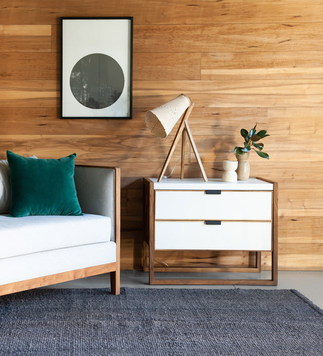 El interior estructural y los frentes es un multilaminado enchapado en madera natural. Todo con una terminación curada y cuidada de aceite de lino natural. ¡Usamos para cada mueble madera de tala certificada!