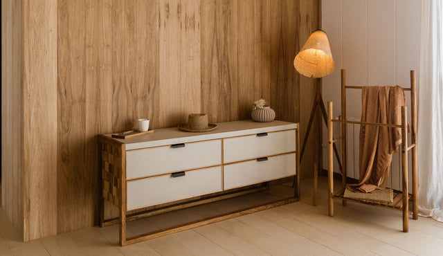 El interior estructural y los frentes es un multilaminado enchapado en madera natural. Todo con una terminación curada y cuidada de aceite de lino natural. ¡Usamos para cada mueble madera de tala certificada!